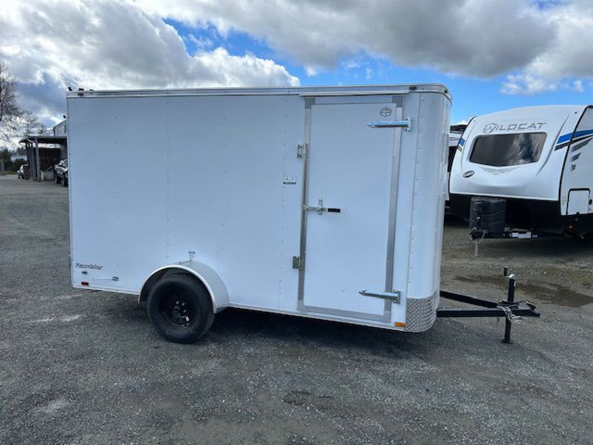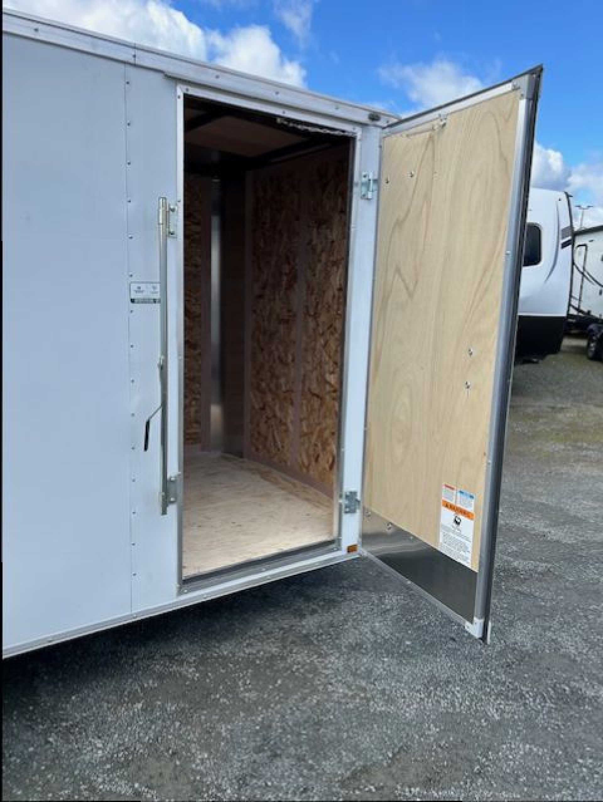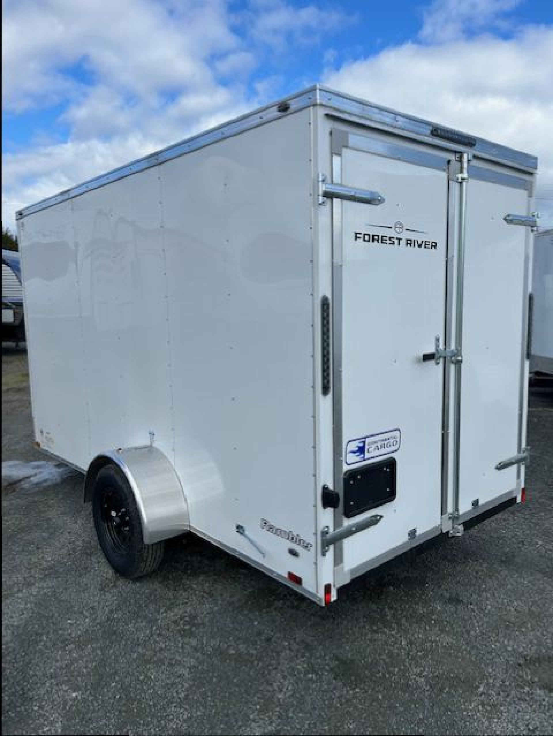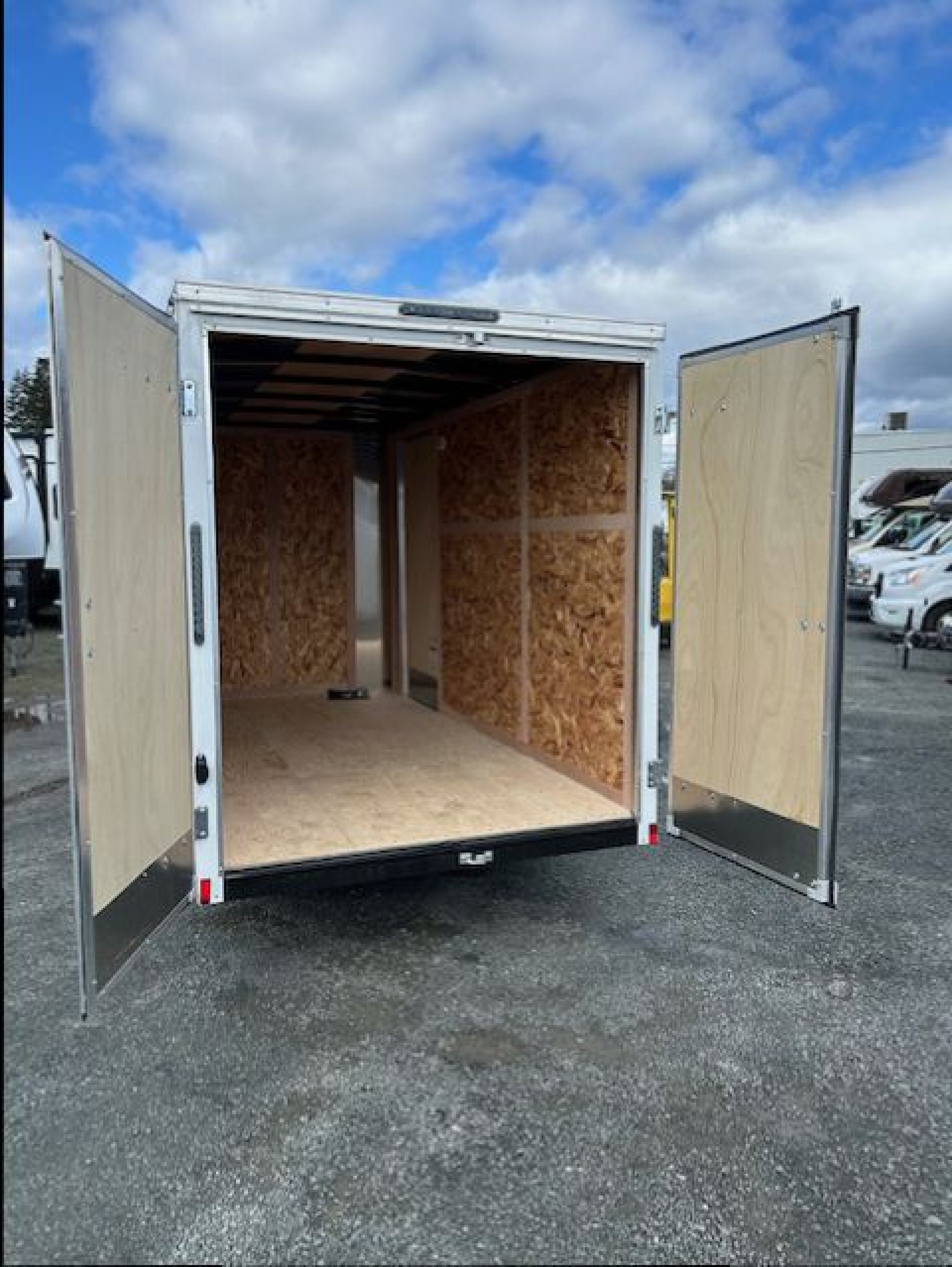 6" Extra Height, Steel Framed Walls, Floor & Roof, Barn Rear Doors, 3/8" Engineered Wood Paneling On Walls (24" o/c), 3/4 Plywood Floor (24" o/c), Semi Style Camlock Door Latch on Doors, ATP Exterior Aluminum Fenders, Leaf-Spring Axles All-Wheel Electric Brakes w/Breakaway* 12-Volt Breakaway Switch with Battery* *(On Models Requiring Brakes) Black Powder Coated Wheels with Black Center Caps, Radial Tires, Galvanized Roof, C/S Door (24" on 5 wide) (32" on 6 wide, 36" on 7 & 8 wide), 12" Stoneguard, 1 – Interior LED Dome Light, Clear Lens LED Clearance Lights, Clear Lens LED Strip Tail Lights, .030 White Aluminum Exterior