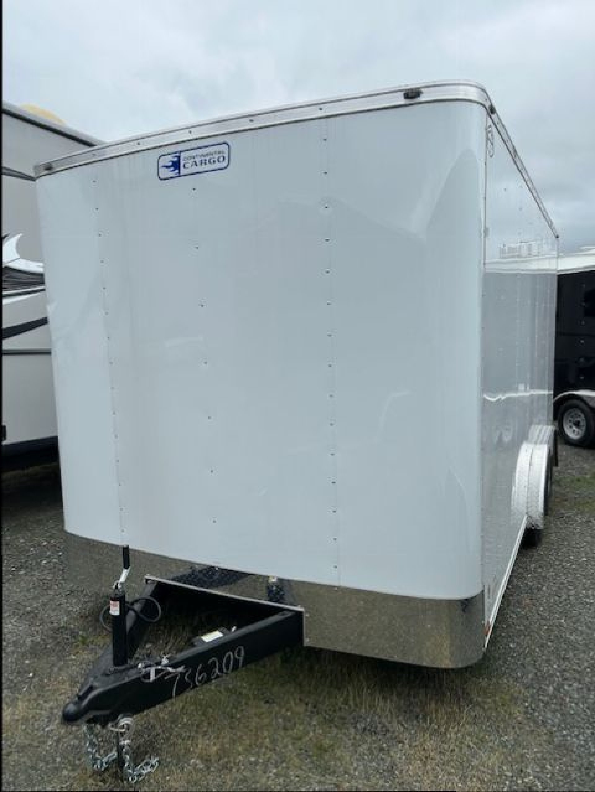 Continental 8x16 Rambler trailer has a 7,000 lb GVWR, a dry weight around 2,400 lbs, and an 8-foot overall width. Standard features include two 3,500 lb axles, tandem electric brakes, a galvanized roof, ramp rear door, two LED dome lights, a roof vent, and an aluminum exterior.