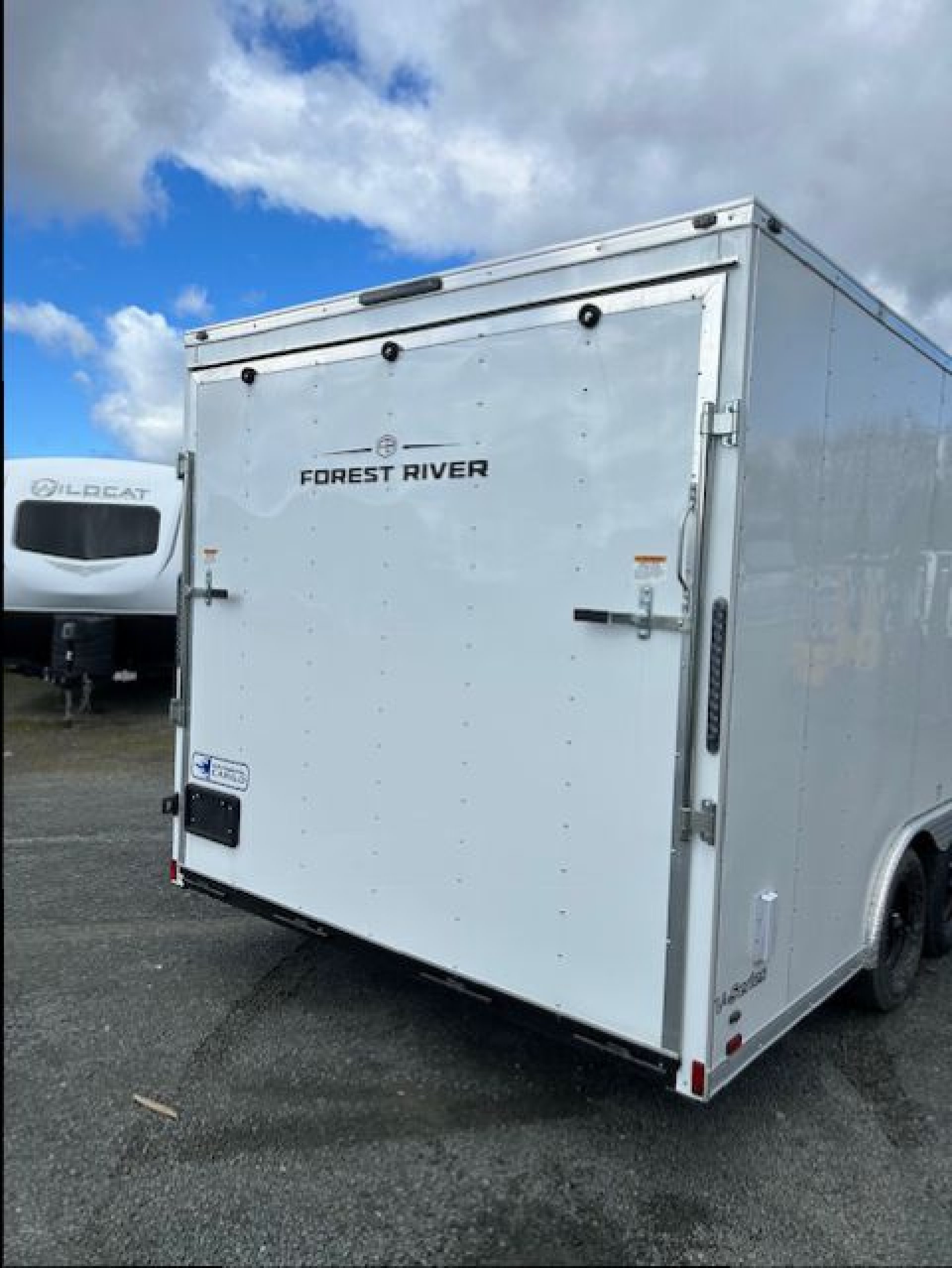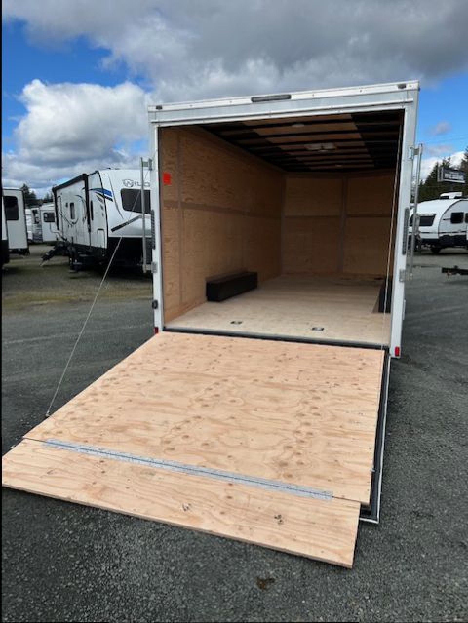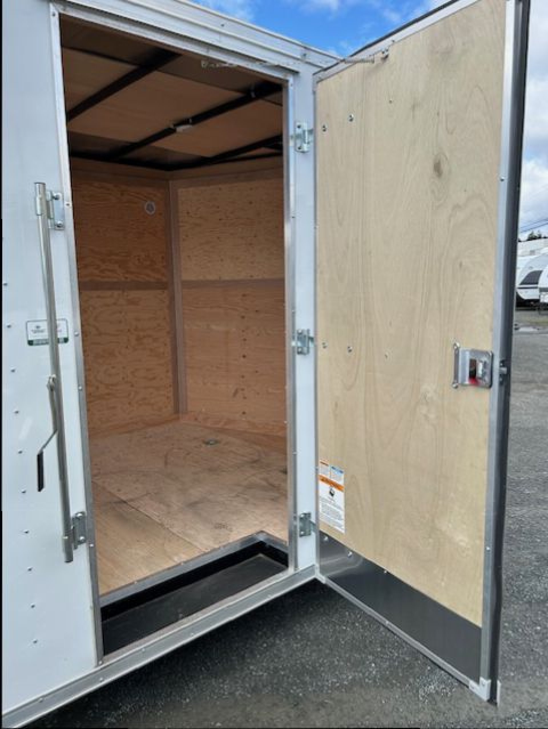 Steel Framed Walls, Floor & Roof, Ramp Rear Door, 3/8" Engineered Wood Paneling On Walls (24" o/c), 3/4 Plywood Floor (24" o/c), Semi Style Camlock Door Latch on Doors, ATP Exterior Aluminum Fenders, Leaf-Spring Axles All-Wheel Electric Brakes w/Breakaway* 12-Volt Breakaway Switch with Battery* *(On Models Requiring Brakes) Black Powder Coated Wheels with Black Center Caps, Radial Tires, Galvanized Roof, C/S Door (24" on 5 wide) (32" on 6 wide, 36" on 7 & 8 wide), 12" Stoneguard, 1 – Interior LED Dome Light, Clear Lens LED Clearance Lights, Clear Lens LED Strip Tail Lights, .030 White Aluminum Exterior