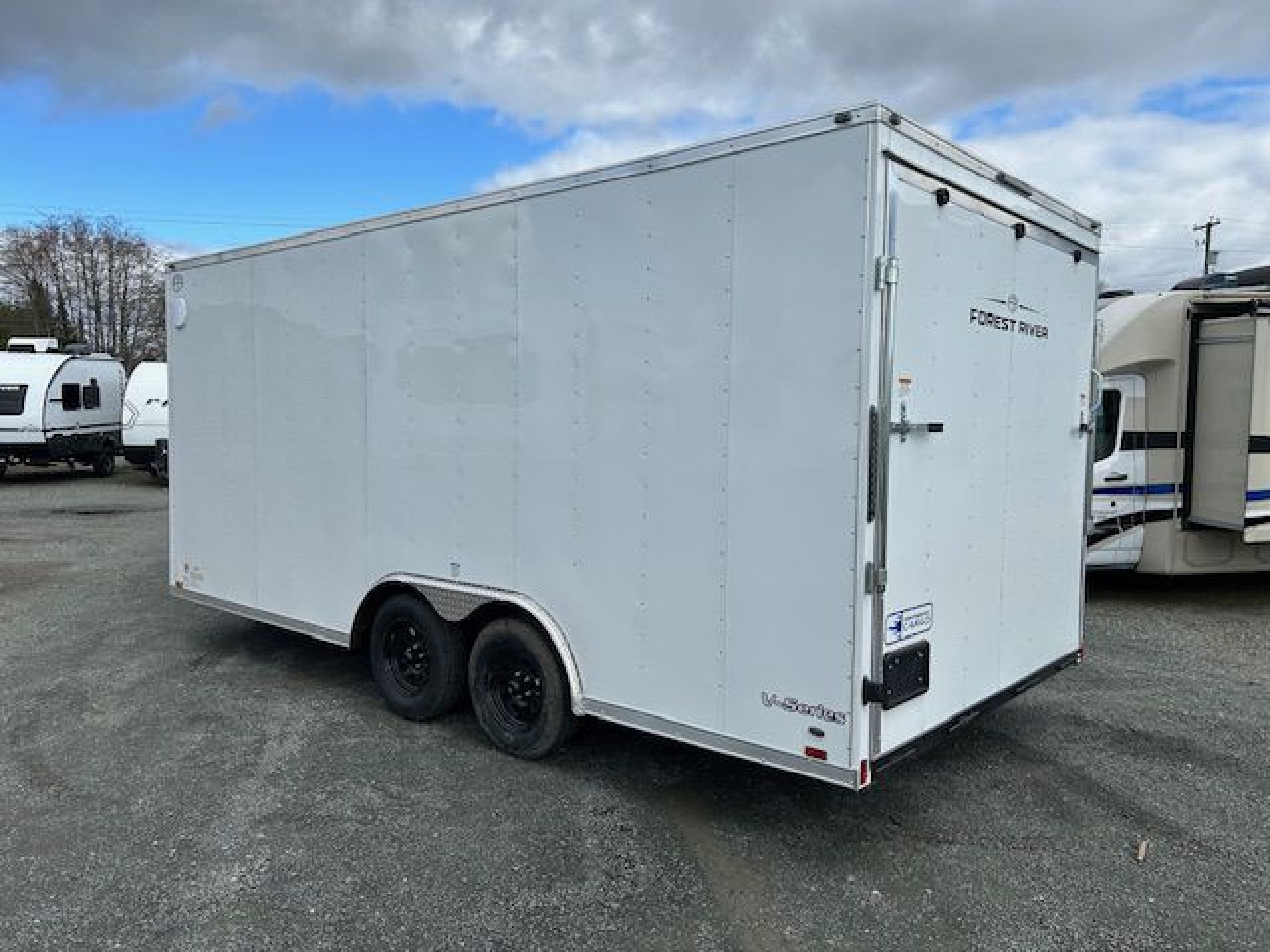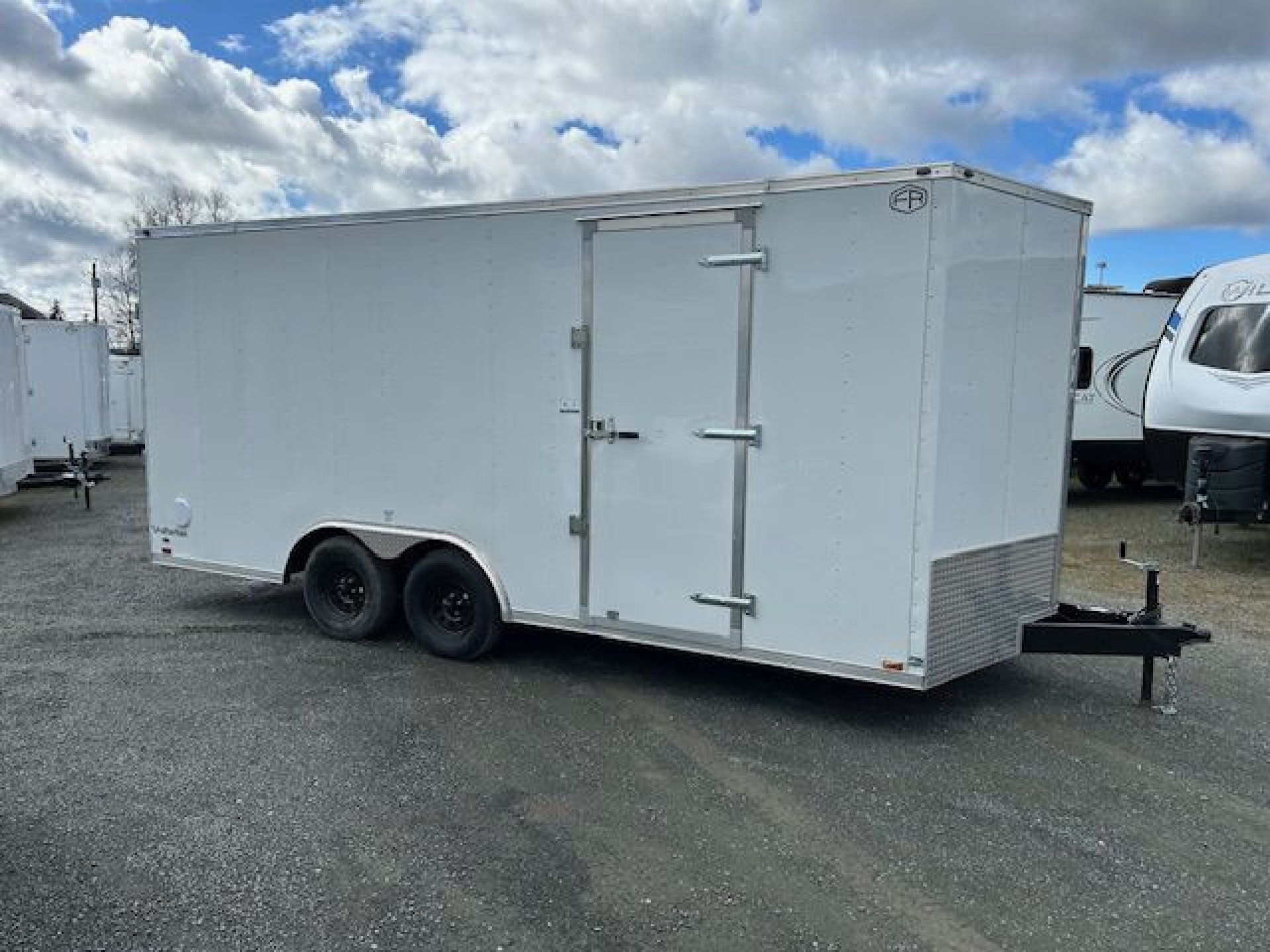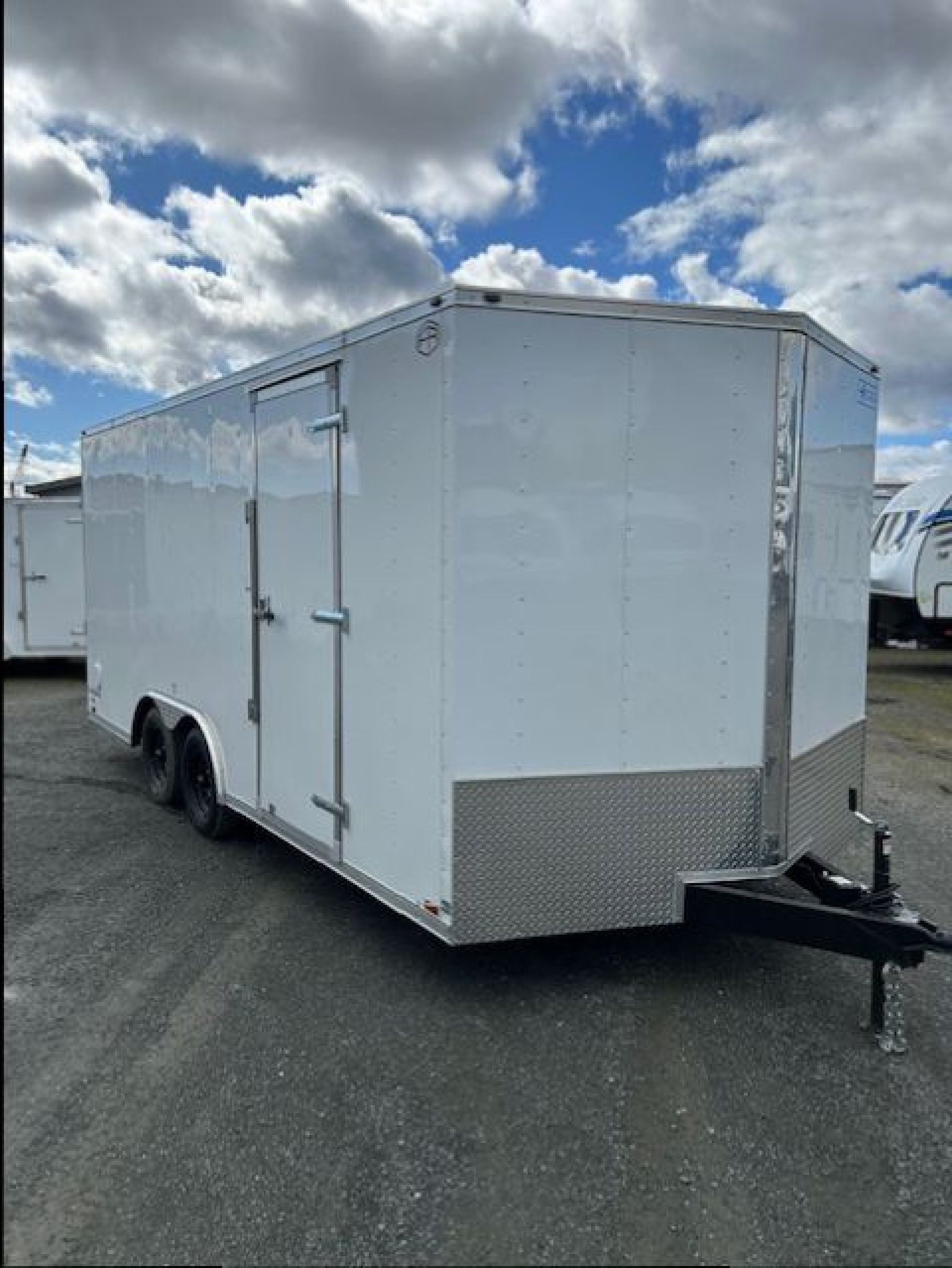 Steel Framed Walls, Floor & Roof, Ramp Rear Door, 3/8" Engineered Wood Paneling On Walls (24" o/c), 3/4 Plywood Floor (24" o/c), Semi Style Camlock Door Latch on Doors, ATP Exterior Aluminum Fenders, Leaf-Spring Axles All-Wheel Electric Brakes w/Breakaway* 12-Volt Breakaway Switch with Battery* *(On Models Requiring Brakes) Black Powder Coated Wheels with Black Center Caps, Radial Tires, Galvanized Roof, C/S Door (24" on 5 wide) (32" on 6 wide, 36" on 7 & 8 wide), 12" Stoneguard, 1 – Interior LED Dome Light, Clear Lens LED Clearance Lights, Clear Lens LED Strip Tail Lights, .030 White Aluminum Exterior