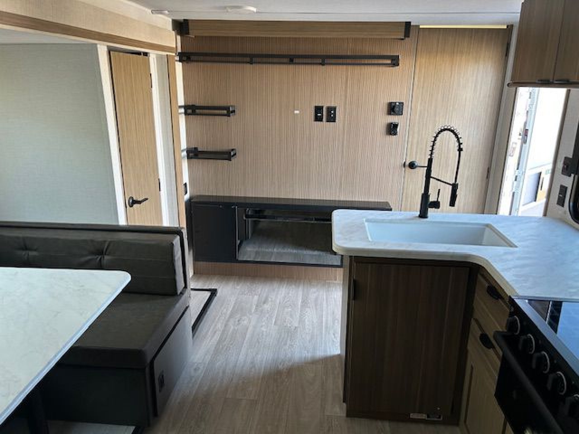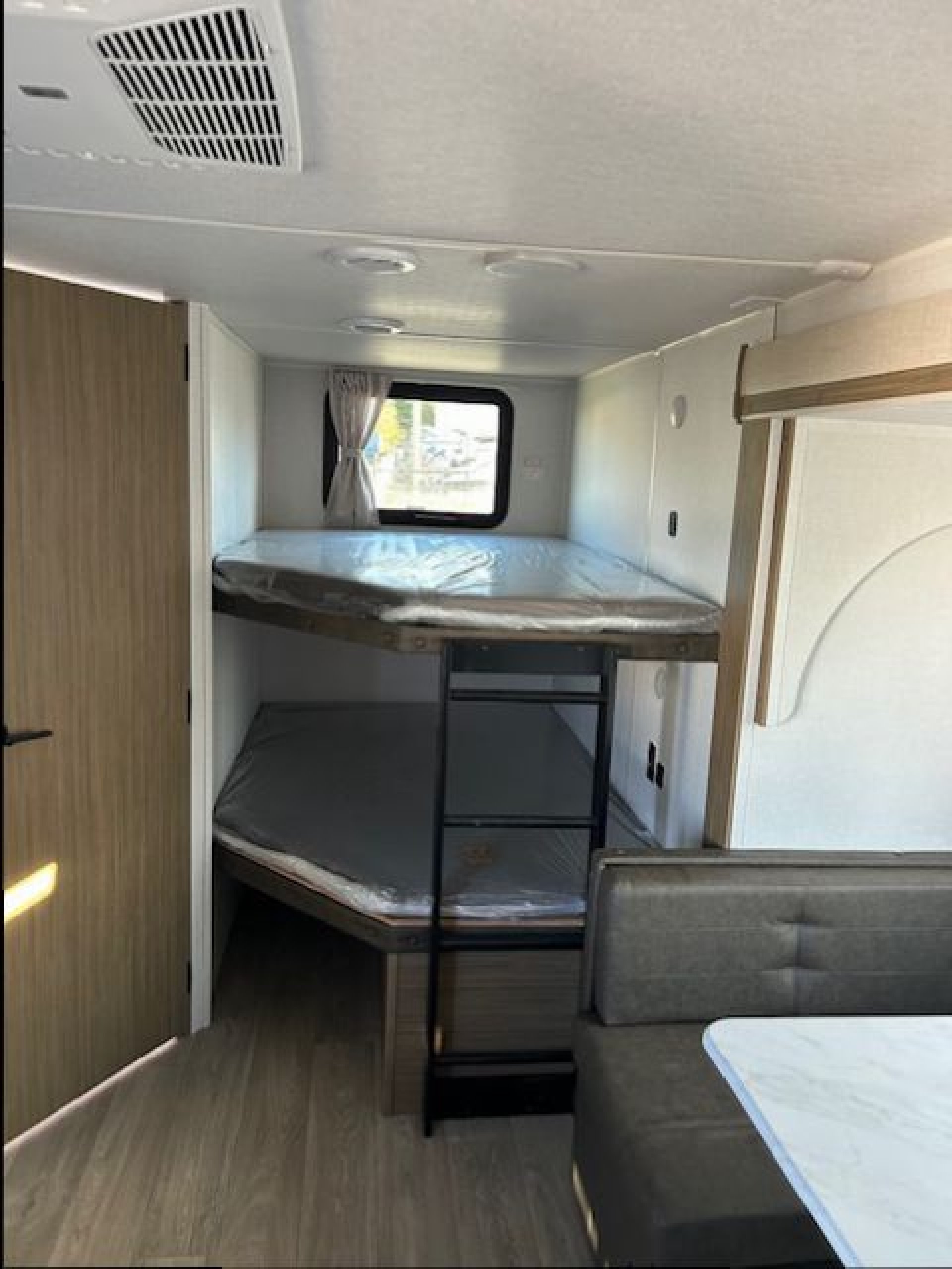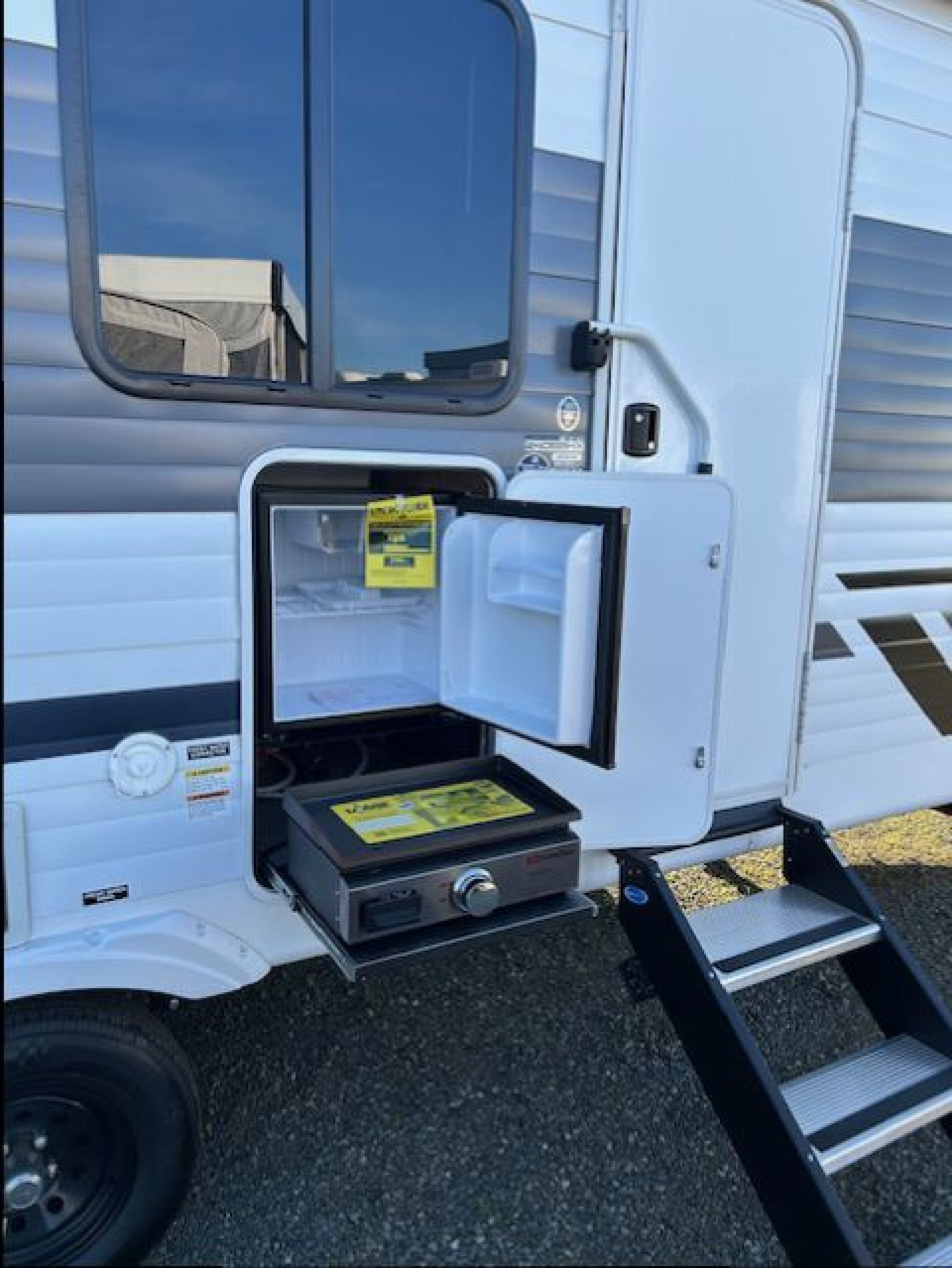 The Evo's eye catching interiors have been painstakingly designed and developed by industry specialists with form, function and style in mind. Attention to detail is what sets Evo apart from the rest.This model is combines space and function into and excellent family package with double wide bunks, large dinette and entertainment wall. The outside bathroom door option allows use of the washroom without having to walk through the trailer. And with the convenience of the Outside grill and fridge everyone has quick access to drinks and hot dogs!