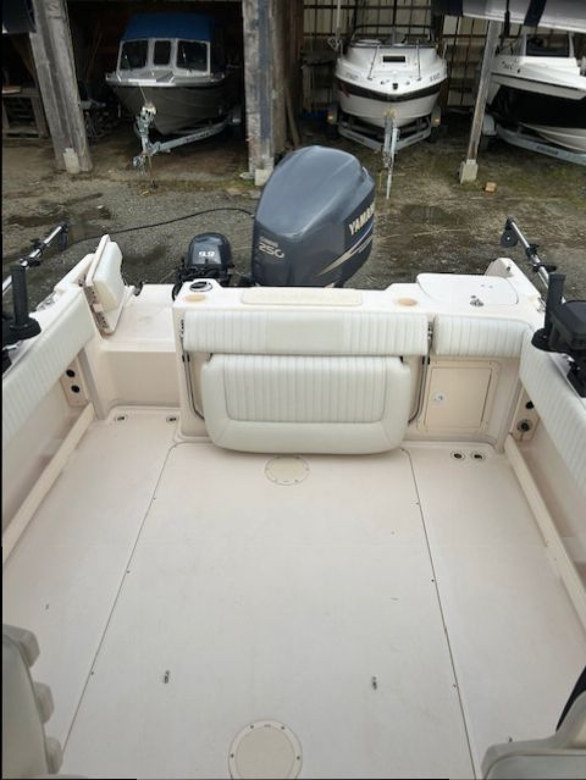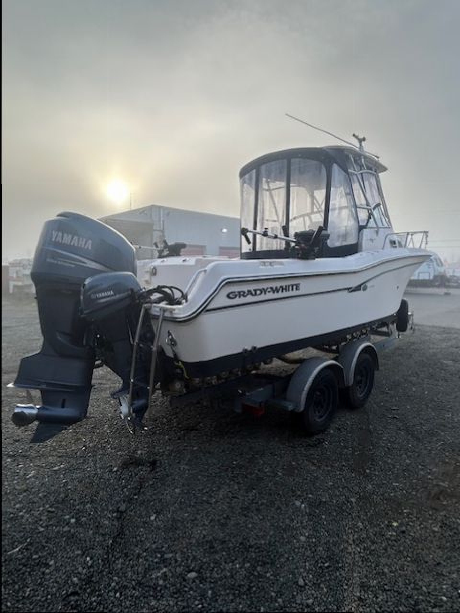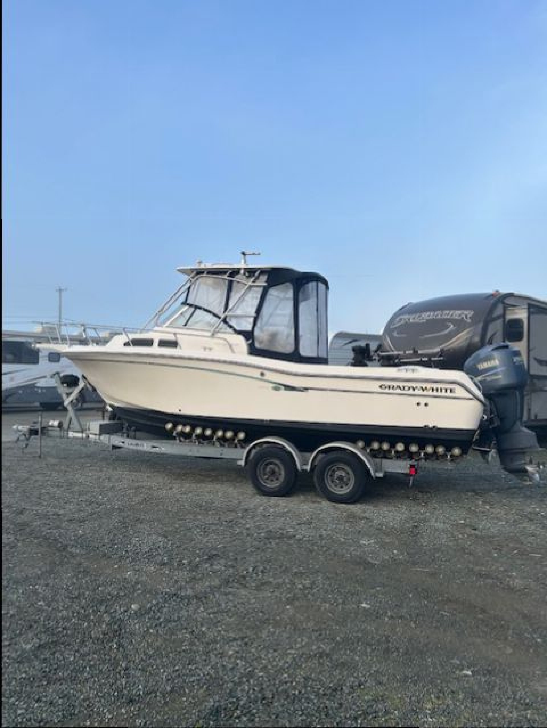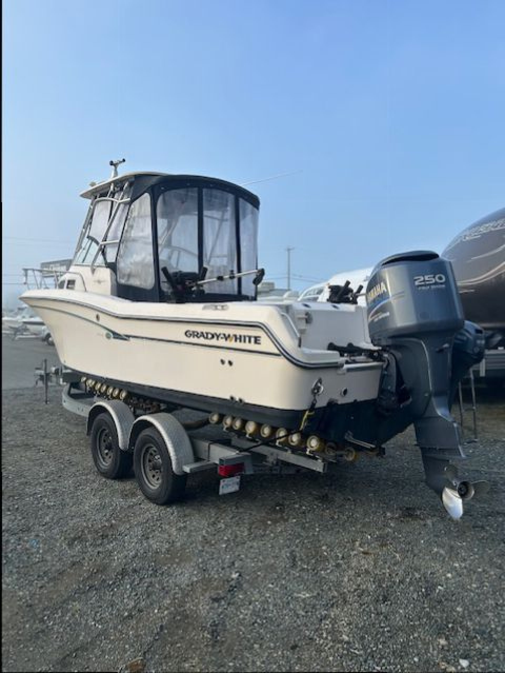 This Beautiful Grady comes equipped with New Canvas surround (2025), New Upholstered side bolsters and seats (2025), New Planar 2D ducted diesel heater (2025), New Yamaha 9.9 kicker (2024). The main Yamaha 250 has less than 500 hours on it and fully maintained. This Grady also comes with 3 Scotty down riggers and a Lowrance HDS 9 Plotter. powered windlass anchor, live well, fresh water wash down. Lots of extras, This vessel is ready to fish today and comes fully equipped. If you like to fish Tuna on the west coast there is a complete Tuna Fishing outrigger kit, poles, roof mount station, extra rocket launchers. The Loadrite trailer is in excellent condition ande includes a power winch and a spare tire.